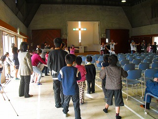 体育館に集まる愛児園の子ども達![]()